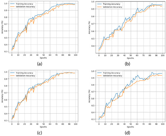 The training and validation accuracy trends for four datasets, labeled as (a), (b), (c), and (d) for Dataset A, Dataset B, subDataset C, and subDataset D, respectively, are illustrated in Figure 7 over 100 epochs. The models’ capacity to learn and generalize to the validation set is demonstrated by the fact that both the training and validation accuracies generally improve as the number of epochs increases across all the subfigures. The validation accuracy exhibited some fluctuations, particularly in the earlier epochs, which may indicate minor overfitting or adjustments during the learning process. In the final epochs, all the models attained relatively stable and high accuracy values, thereby demonstrating effective training and convergence for both the training and validation phases. A comparable pattern is depicted in each subfigure; however, the learning dynamics and ultimate accuracy levels of the specific configurations differ.