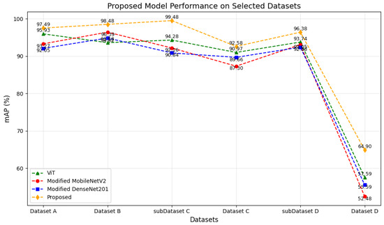 On selected datasets, Figure 8 displays the performance of four models—ViT, modified MobileNetV2, modified DenseNet201, and the proposed model—in terms of mAP. The proposed model consistently outperformed the other three models across the datasets, obtaining the highest mAP scores, particularly on Dataset A with 97.49% and subDataset C with 99.48%. Although the efficacy of the ViT, modified MobileNetV2, and modified DenseNet201 varied slightly across the datasets, all of the models demonstrated a substantial decrease in mAP on Dataset D, with values ranging from 52.48% for the modified MobileNetV2 to 64.90% for the proposed model. The challenge that Dataset D presented to all the models is underscored by this decline. The proposed model’s superior performance across the majority of the datasets is emphasized in Figure 8, which also highlights its robustness in comparison to its counterparts.