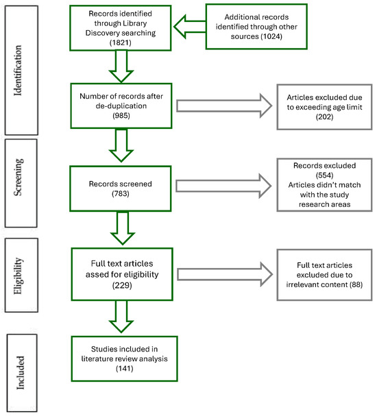This systematic literature review uses a PRISMA (Preferred Reporting Items for Systematic Review or Meta-Analysis) flow to locate and determine the relevance of the literature to the overall research aim and research questions [7] (Figure 1). A comprehensive search was used on various research databases between February and July 2024, using the keywords “artificial intelligence”, “marketing”, “bias”, “marketing technology” and “marketing customer journey”. The initial search delivered 1845 results, and after removing duplication, 985 sources remained. To ensure relevance and applicability, these articles were screened with two filters: the first to ensure relevance to the research area and the second to restrict publication dates between January 2016 and July 2024. Broad search terms were deliberately used to gain a holistic picture of the literature for AI, bias and digital marketing; however, each piece of literature had to focus on at least two of these three core areas to be eligible. Once the publication period had been applied and a meticulous screening of relevant literature had been conducted, the final count of core sources for the research project was 141. The analysis of these sources provided some initial findings as regards RQ1, which are extended and developed in light of the primary research results reported in Section 4. This literature synthesis allowed a categorisation of findings and development of the provisional conceptual framework, which was then used for questionnaire and interview design.