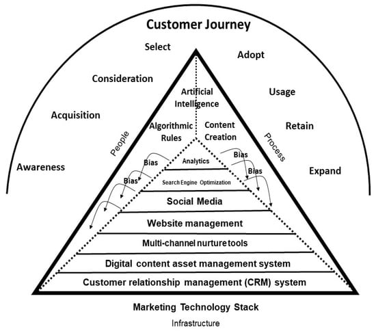 People, processes, and infrastructure were also identified within the literature review as appropriate categories for a top-line classification of the management of AI within a company [40]. In this context, the Martech Stack can be viewed as the infrastructure element, the marketing customer journey is the process element, and the exploration of people (marketeers) is part of the analysis of the primary research. It requires the appropriate combination and interaction of people, process and infrastructure elements within companies to reveal and mitigate bias perpetuation.