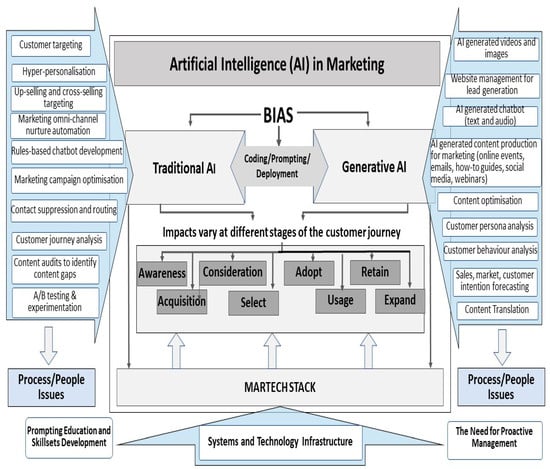 The Martech Stack is a collection of integrated software made up of customer relationship management (CRM) systems, social media, analytics, and websites that may use real-time AI algorithms to optimise usage [11]. AI improves these systems by modelling predictive outcomes, algorithmic clusters and enabling personalisation at scale; however, it risks introducing biases from incomplete or skewed datasets, potentially suppressing genuine buyers and misrepresenting consumer behaviour. Continuous human oversight is critical to maintain ethical marketing funnels and prevent automated biases from influencing decision-making [2,12,13].