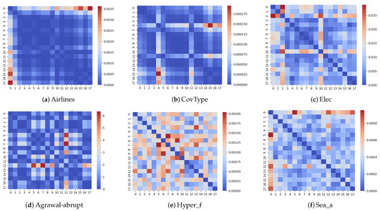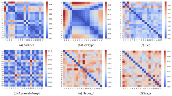 The Bray–Curtis dissimilarity thus measures the proportional differences between the data blocks based on the feature comparisons. Figure 2 depicts, through heatmaps and using the Bray–Curtis dissimilarity metric, the distance between each pair of data blocks in six datasets. The top row consists of real-world datasets, while the bottom row consists of synthetic datasets. In these images, a dark-blue color indicates a very small distance, whereas a dark red indicates a large distance. The diagonal has a zero distance as it represents the distance between each block and itself. The values of distance using the Bray–Curtis dissimilarity range between 0 (equal vectors) and 1 (completely different vectors).