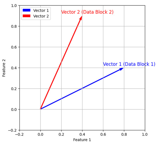 The intuition behind the cosine similarity is depicted in Figure 3 for a bi-dimensional feature space. In this representation, each arrow represents the feature vector of one data block, both starting at the origin. The closer the vectors are to each other, the more similar they are. The same principle applies in a higher-dimensional feature space, but its visualization becomes impracticable. Cosine similarity ranges from −1 to 1, where 1 indicates identical vectors, 0 indicates orthogonality (no similarity), and −1 indicates completely opposite vectors.