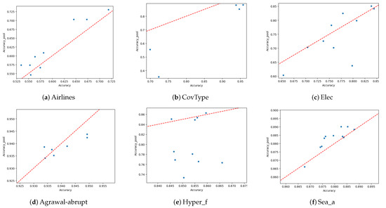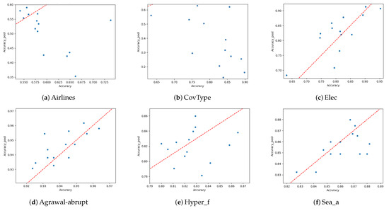 The first phase consisted of pre-selecting a set of meta-features for posterior validation. In this process, we used several datasets (already shown in Figure 2 and Figure 4), both real-world and synthetic, exhibiting different types of concept drift (gradual and abrupt). Real-world datasets include Airlines, CovType, and Electricity (Elec), while synthetic datasets include Agrawal-abrupt, Hyper_f, and Sea_a [17,18,19].