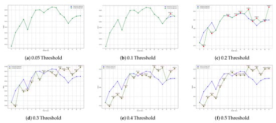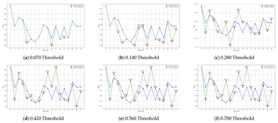 Table 5 and Table 6 summarize the results for different thresholds for the airlines dataset, using the cosine and Bray–Curtis distance metrics, respectively. Table 7 and Table 8 do the same for the sea dataset.