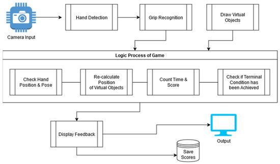 The basic architecture of the games can be summarized by an algorithm similar to the one presented in Figure 2. Upon initialization of the applications, we access the camera stream and display it on the screen. We use the MediaPipe library to identify hands within the stream and overlay colored circles on the landmarks detected by the toolkit. This helps indicate whether the hands are accurately recognized. At the same time, we draw graphics that guide the gameplay, such as blocks that the user must move, outlines indicating target positions, obstacles to avoid, etc. Moreover, we create essential assistant buttons and counters that track scores, function as timers, and allow users to quit the exercises at any time. We use the fingertip positions within the frame to determine whether the user is performing a required grip. This is achieved by measuring the distance between the fingertips. While a user maintains a designated pinch, we calculate whether their hand overlaps with any of the given graphics, and we reposition shapes as dictated by the application settings. After completing an exercise, we provide users with performance feedback by displaying a score, while offering the option to save it for future reference.