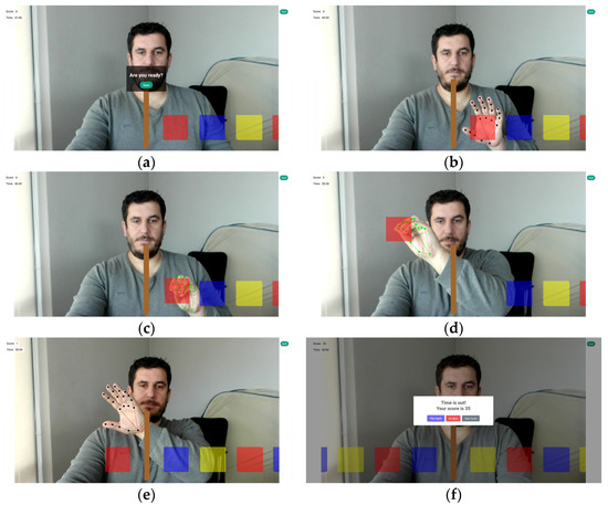Let us describe a step-by-step demonstration of Game 1 (BBT) on our platform, to provide better understanding of how our system’s serious games function. Upon opening the application, the user must ensure that the camera feed is displayed on the computer screen and that they are visible near the center of the frame, at a distance of approximately 50 cm from the camera, as shown in Figure 3a. Then, the start button appearing at the center of the screen can be pressed. When this button is pressed, the exercise starts, and the screen displays some blocks on one side of the frame, a partition in the middle (with height close to half of the screen), a quit button at the top-right corner, and two counters at the top-left one. The quit button allows users to terminate the exercise at any point they choose, while the two counters track the user’s score and the seconds remaining until the exercise ends. First, the user needs to place their exercising hand over one of the blocks, with fingers open and the palm facing the camera, as shown in Figure 3b. After that, they must touch their fingers together to grab the block. Users can either touch all their fingertips together or just the tips of the thumb, the pointer, and the middle finger. Note that the blocks are semi-transparent, so patients do not lose track of their hand’s position on the screen. When successfully grabbing a block, the hand landmarks change to green, as shown in Figure 3c. If the user touches their fingers together without being positioned over a block, no shape is grabbed, and the hand landmarks turn white. While grabbing a block and maintaining the grip, the block follows the hand movements, allowing users to relocate it. This enables us to move blocks to the other side of the screen, as shown in Figure 3d, while avoiding the partition, as objects cannot pass through it. If the grip is lost while moving a block, the block stops where it was released, requiring the user to grab it again. When successfully passing a shape to the other side of the partition, the user releases it by opening their fingers, placing it in line at the new area, and earning a point, as seen in Figure 3e. The main goal of the game is to transfer as many blocks as possible to the opposite side within one minute. When the timer reaches zero, the final score is displayed, as shown in Figure 3f, and the user can choose to save it.