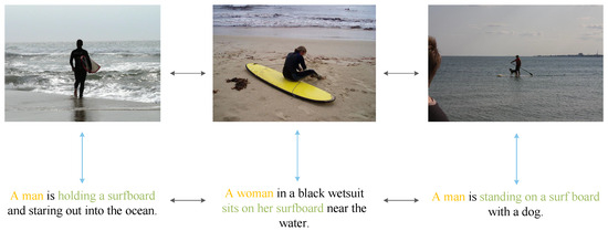 Image–text retrieval methods typically consist of the following key modules [7]: modality embedding, modality interaction, and similarity computation modules. Modality embedding is used to extract visual and textual features. Modality interaction, which can be categorized into intramodal interaction [8,9] and cross-modal interaction methods [10,11,12], is responsible for learning similar features, establishing associations and alignments between images and texts, and uncovering semantic relationships across modalities. Similarity computation is used to quantify the semantic relevance between data derived from different modalities according to specific criteria, facilitating effective modality alignment. Generally, similarity computation relies on triplet loss [13] functions to differentiate between semantically similar and dissimilar samples. However, these methods struggle with fine-grained discrimination tasks and handling hard negatives. As shown in Figure 1, in the case of the “surfing” theme, subtle differences are present between actions such as “holding a surfboard” and “squatting on the surfboard” or “standing on the surfboard”, which are difficult to distinguish. The existing methods may fail to correctly identify such hard negatives, which impacts the alignment between different modalities. Moreover, the triplet loss suffers from the challenge of selecting appropriate margin parameters and its sensitivity to scale changes, with improper margin choices often leading to poor embedding learning results [14,15].