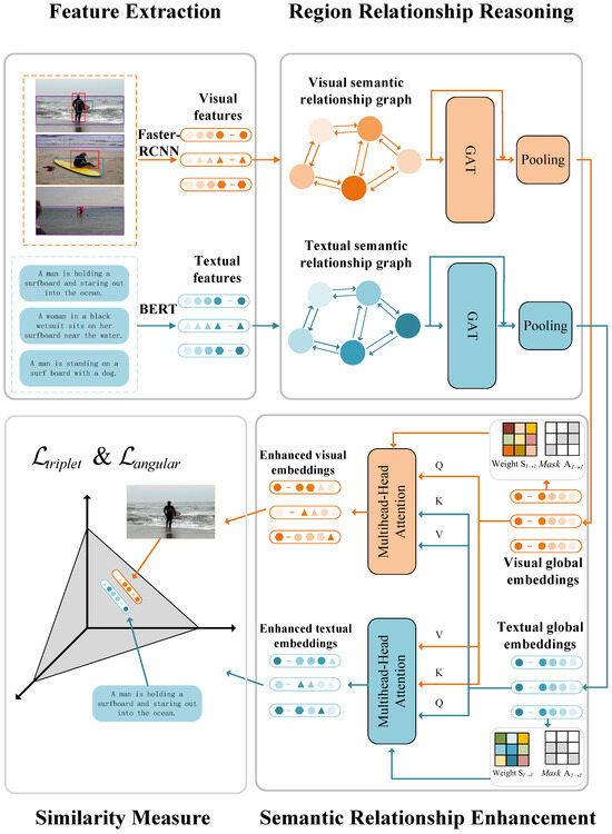 First, features are extracted from both images and texts; this is followed by region relationship reasoning, which is implemented using a graph attention network (GAT). Next, the relationships between different samples within the same modality are incorporated into a relational graph, and an attention mechanism is applied for semantic interaction purposes. This enables the information across different modality samples to be comprehensively learned, resulting in semantically enriched image and text embeddings. Finally, the triplet ranking loss is combined with the AL to optimize the gradient direction of the negative samples, achieving better alignment and enhancing the robustness of the model under significant data variations. Figure 2 shows the structure of proposed method.