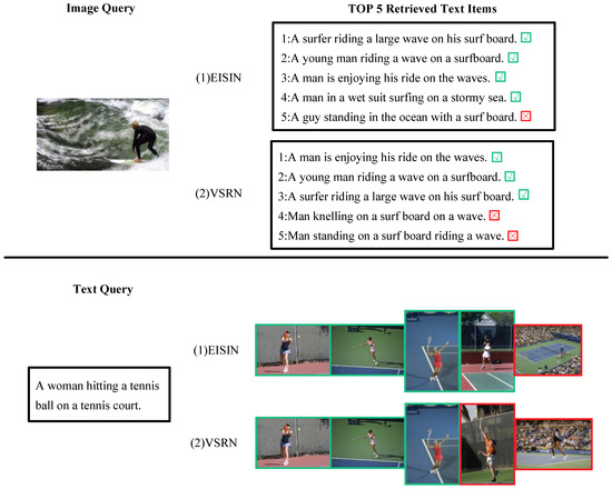 Additionally, to visually demonstrate the superiority of the EISIN framework, Figure 4 compares two image–text retrieval methods, the EISIN and VSRN [2], with green markers indicating correct retrievals and red markers indicating incorrect retrievals. As shown, the EISIN outperforms the VSRN [2] in terms of its image–text retrieval ability.