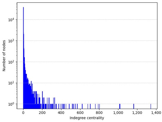 Distribution of indegree centrality values in (semi-log scale).