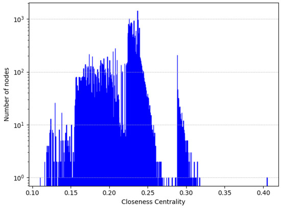 Let us now consider closeness centrality. In Figure 2, we show the distribution of the values of this centrality in in semi-log scale. Note that there is a bell-shaped distribution, which is typical for closeness centrality [29]. Actually, the distribution more closely resembles a superposition of at least two bell-shaped curves with different heights and a “half-bell-shaped” curve. Furthermore, it has long tails on both the left and the right. The figure shows that there are few nodes that have high closeness centrality values and are therefore connected to other nodes by very short paths. Moreover, most nodes have medium or medium-low closeness centrality values and are therefore connected to other nodes by paths that are neither too long nor too short. Finally, few nodes have low closeness centrality values and are therefore connected to other nodes by long paths.