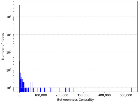 Distribution of betweenness centrality values in (semi-log scale).