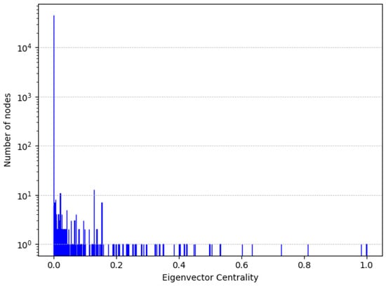 Distribution of eigenvector centrality values in (semi-log scale).