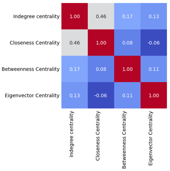 At this point, it is interesting to check if there are any correlations between the different centrality measures. To perform such a check, we thought to rely on Spearman’s correlation coefficient [51] and calculated its value for each pair of centralities mentioned above. Remember that this coefficient can consider values in the real range , where −1 indicates a perfect negative correlation, 0 denotes no correlation, and 1 indicates a perfect positive correlation. The results obtained are shown in Figure 5.