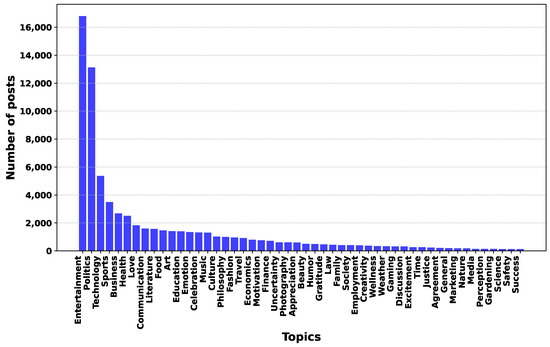 Figure 6 shows the distribution of posts against topics. In particular, for layout reasons, we show only the 50 topics with the highest number of associated posts. Analyzing this figure, we can see that this distribution follows a power law. In fact, there are two topics, i.e., “Entertainment” and “Politics”, which have a much higher number of associated posts than all the other topics. A third topic that is quite common is “Technology”. Starting with the fourth topic, i.e., “Sports”, we see a slow decrease in the number of posts associated with each topic.