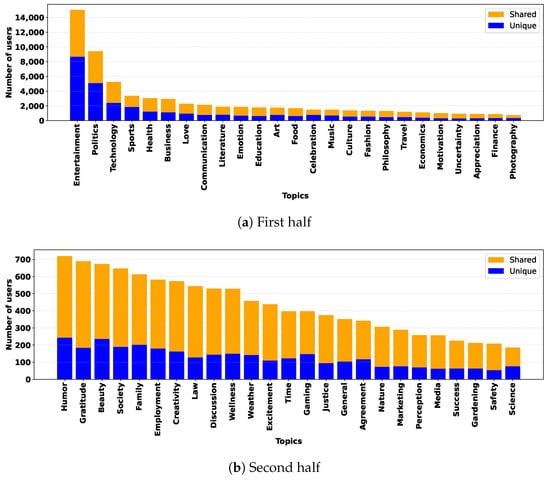 Distribution of users against topics and their division into the classes “unique” and “shared” (50 most frequent topics in ). In the two plots, the scale on the y-axis is different because it is related to the topic of the graph with the largest number of nodes.