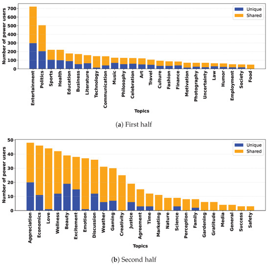 Distribution of power users against topics and their division into the classes “unique” and “shared” (50 most frequent topics in ). In the two plots, the scale on the y-axis is different because it is related to the topic of the graph with the largest number of nodes.