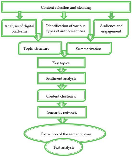 After data collection and cleaning, the following procedures were carried out: identification and classification of actor types, audience analysis, and engagement assessment; an examination of audience characteristics and engagement levels. Subsequently, the thematic structure was extracted, and key content topics were identified. Sentiment analysis facilitated database clustering by sentiment, after which a semantic network was constructed for each cluster, and the core of the semantic network was identified (Figure 4).