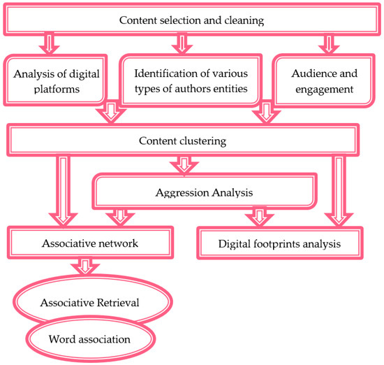 When developing an algorithm utilizing neural network tools for detecting implicit information in user-generated content and digital traces in social media, special attention was given to the analysis of digital aggression and associative networks. In the analysis of implicit knowledge, content was clustered based on the presence or absence of aggression. Unlike sentiment, aggression provides a more accurate measure of emotional tension and the hidden intentions of actors. Special attention was also given to analyzing the associative network and lexical associations, which reveal the hidden judgments of actors and enable the analysis of implicit knowledge and actors’ perceptions (Figure 5).