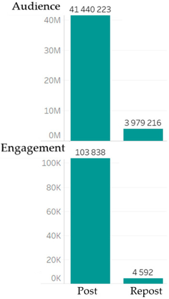 An analysis of message types based on the audience shows a predominance of original posts over reposts (Figure 6).