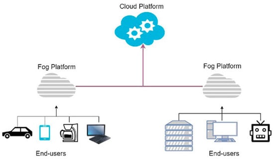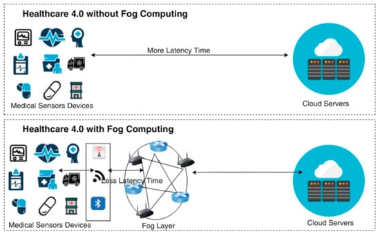 Healthcare benefits from the services provided by Cloud Computing (CC) and Fog Computing (FC). However, accessing data stored in the cloud can result in inadequate response times and noticeable delays. In contrast, FC employs distributed architectures to support both cloud and Edge Computing (EC) []. It links wireless networks and wearable medical devices, offering an enhanced spatial interface to edge devices while reducing latency []. When combined with other technologies, FC optimizes e-health services. It integrates sensors, telecommunications, CC, the Internet of Things (IoT), and big data. Sensors and actuators are the primary components of IoT-based medical devices, which interface with cloud and fog services to generate health data. This real-time data are invaluable for delivering remote care services to patients.