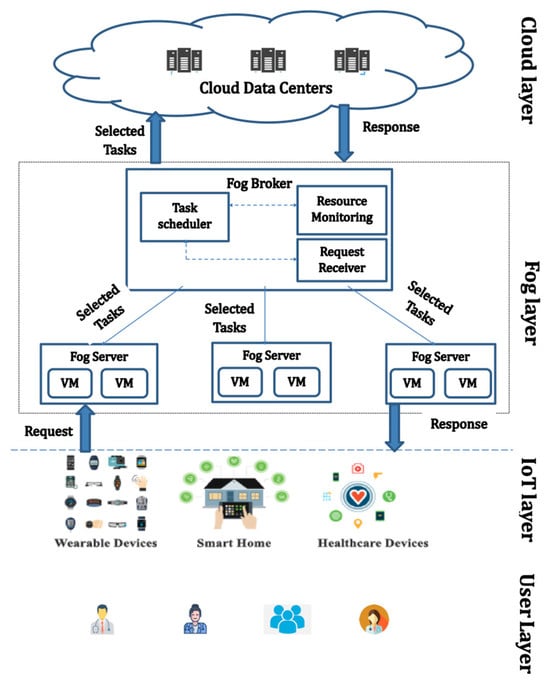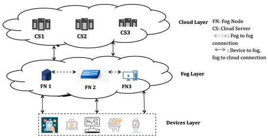 - Cloud Layer: This layer processes tasks that cannot be processed at fog [,]. The fog layer can access the patient’s health data from the cloud layer for analyzing or forecasting [].