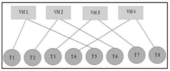 - The expected processing time (EET) for each task on each VM is calculated using Equation (1):where r is the task length and spi is the VM’s speed.