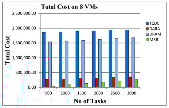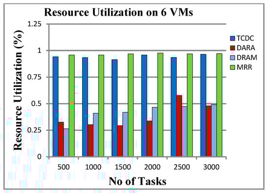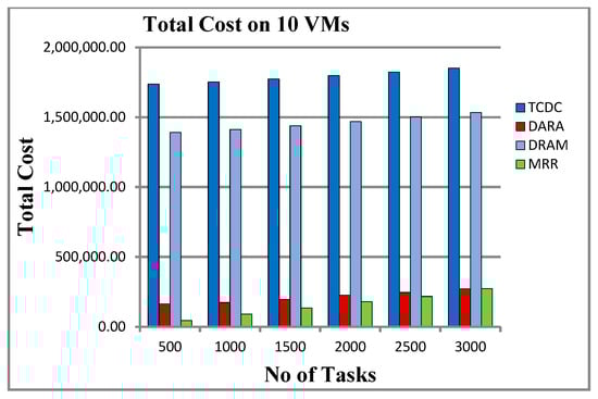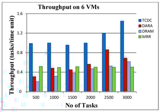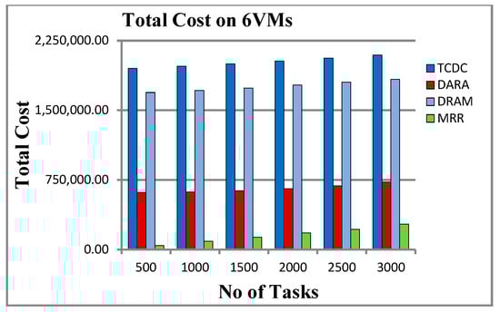 For total cost, TCDC consistently has the highest total cost across all task sizes, reflecting its higher resource demand to achieve superior throughput performance. Its cost increases steadily with the number of tasks. DARA is more cost-effective, with significantly lower total costs, especially in resource-constrained environments. For example, at 500 tasks with 6 VMs, DARA’s cost is much lower than TCDC’s. This trend is observed across all task sizes, indicating that DARA is a more economical choice, albeit with trade-offs in performance (throughput, resource utilization). MRR has the lowest total cost for small task sizes, but its cost rises sharply as task volume increases, making it less efficient at larger scales. Therefore, while MRR is cost-efficient for small tasks, it struggles to scale effectively.