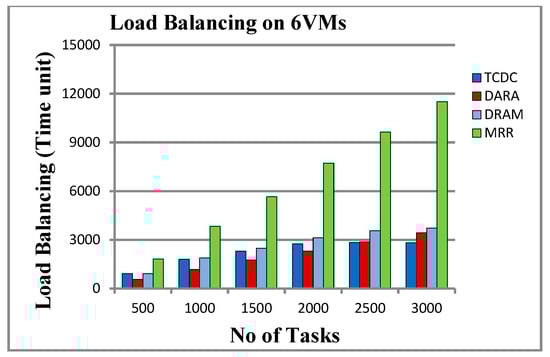 For load balancing, TCDC performs better than other algorithms in load balancing, though its values increase with task load, indicating slightly reduced load balancing as the task size grows. DARA has the lowest load balancing values, particularly for smaller task sizes, and its performance worsens as task size increases. This suggests that DARA struggles more than others in distributing the workload evenly, particularly as the task volume increases. DRAM exhibits poor load balancing, with values similar to or worse than TCDC, especially for larger tasks. This indicates that DRAM is less efficient in balancing the load compared to TCDC and DARA. MRR has the highest load balancing values across all task sizes, which indicates that MRR faces substantial challenges in balancing the load, especially as the task size increases.