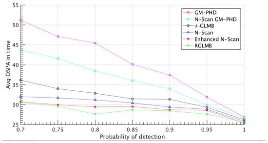 In the -GLMB filtering procedure, the pruning phase might cause weak performance in scenarios with a high uncertainty level (e.g., low detection probability, high clutter ratio, etc.). Suppose that one or more targets are not detected due to miss detection of these targets. Their associated hypotheses weight () will diminish; hence, the associated hypotheses of true tracks are removed from the filtering procedure and cause the filtering performance drop. Furthermore, from a mathematical point of view, as it is obvious in Equation (9), the low detection rate causes the parameter to decrease, and as a result, the multi-state target density decreases. In such conditions, losing true tracks produces a less informative approximation of the posterior distribution in Equation (11), which is clearly obviously inferred from Equations (13)–(15).