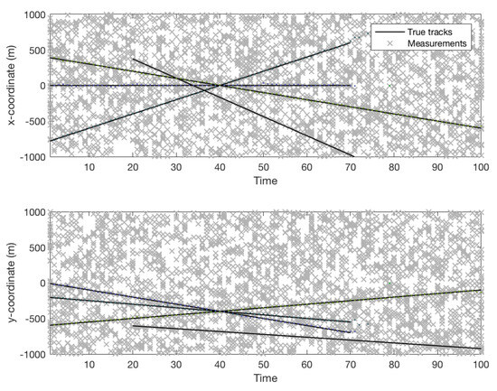 MTT is used to jointly estimate the number of targets and their states from measured observations. Due to the dynamic nature of the MTT problem, the number of targets changes over time. In MTT, the targets and observations are considered as random finite sets, where k is the indicator of time, is the number of targets, and is the number of observations. Some observations may be clutter and others may be missed according to an underlying probability density. is the multi-target likelihood function at time k which encapsulates the underlying models for clutter and detection. is the multi-target transition density at time k which encapsulates the underlying models of births, spawns, deaths, and target motions. The multi-target Bayes filter propagates in time [44] according to the following update and prediction steps: