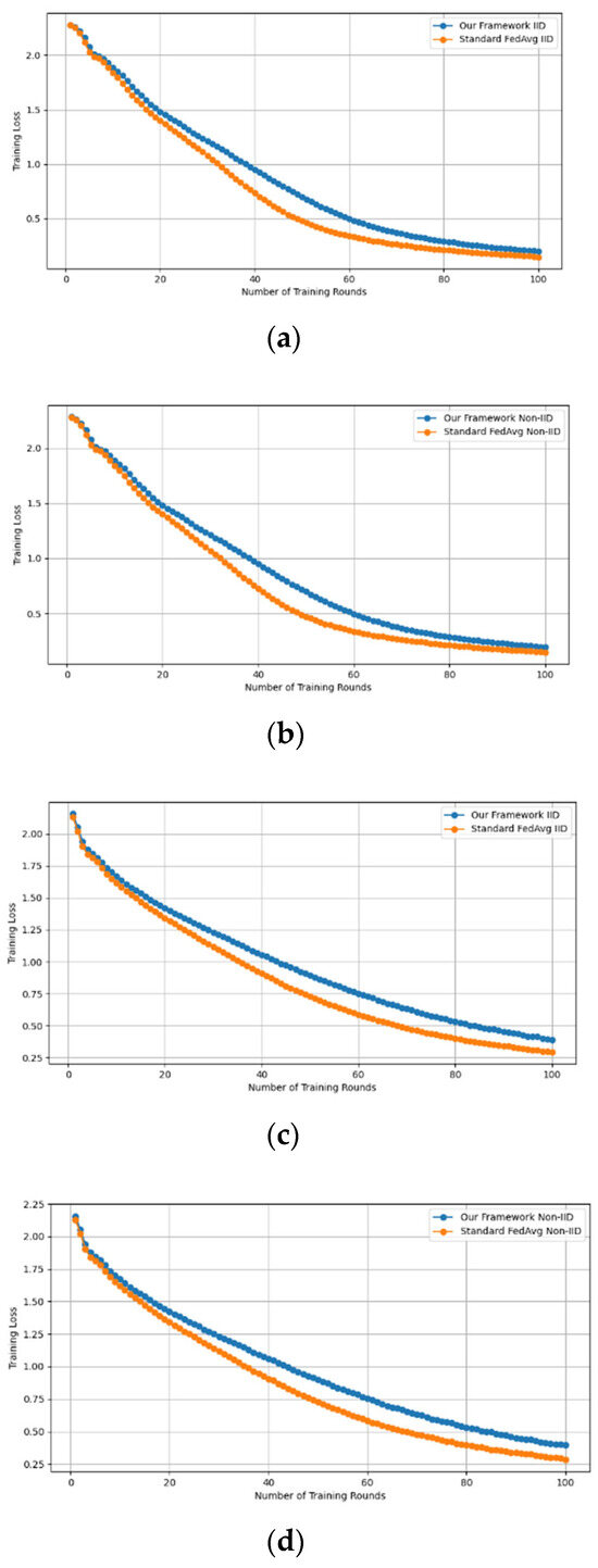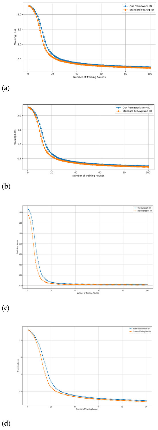 - Fidelity Evaluation: We compared FedAvg and our framework in terms of accuracy and loss to evaluate the fidelity goal when there are no poisoning attackers. In this experiment, the number of participants and communication rounds was set to 100, respectively, with the evaluation carried out using the MNIST and CIFAR-10 datasets over the CNN and MLP models in both IID and non-IID settings. The convergence of our framework and the FedAvg are shown in Figure 2 and Figure 3, using the MNIST and CIFAR-10 datasets over the CNN and MLP models in both IID and non-IID settings, respectively. The two figures illustrate the comparable convergence performance of our framework and a standard FedAvg in terms of training loss and the number of training rounds using both the MNIST and CIFAR-10 datasets over the CNN and MLP models in IID and non-IID settings. In terms of convergence, our framework has no impact on the model’s performance and, as observed, it yields approximately the same result as a standard FedAVG without any privacy-preserving mechanisms or poisoning attack-resilient methods. The results show that our framework does not impact model performance but performs equally well as a standard FedAvg offering additional benefits such as stability and robustness.