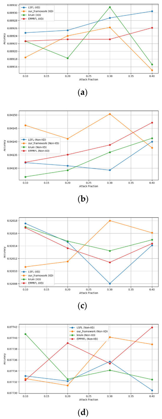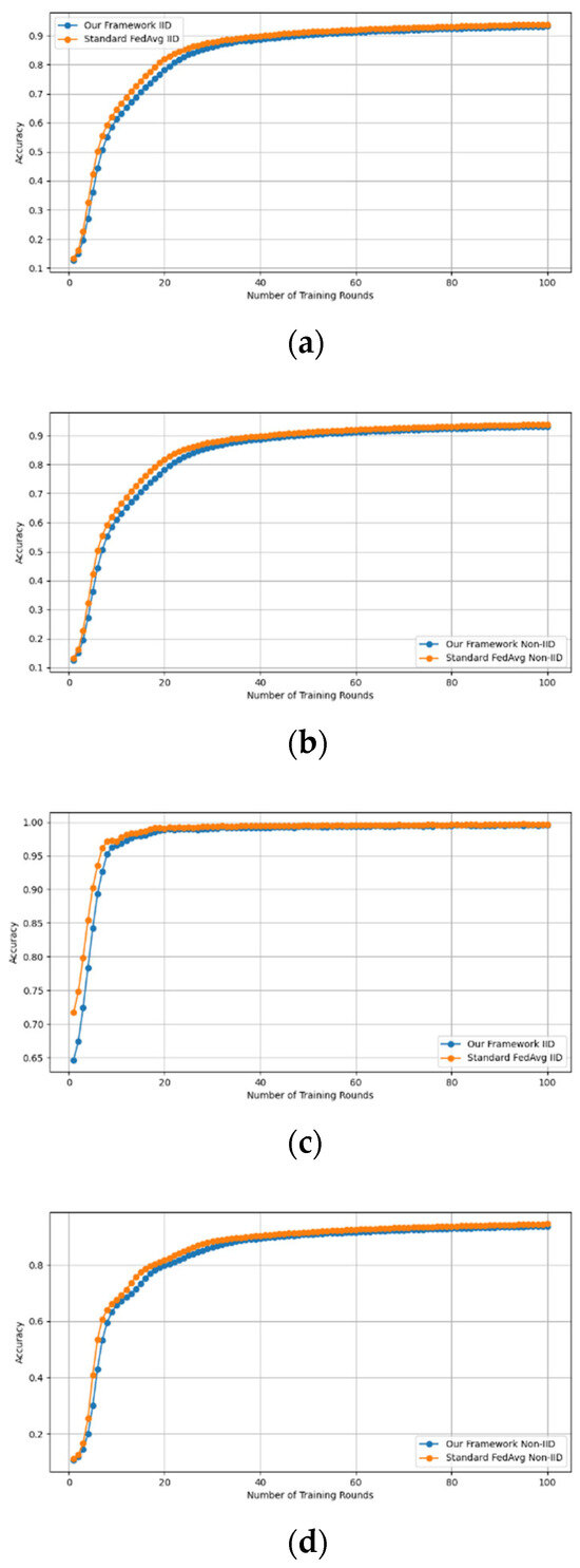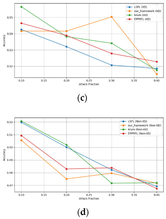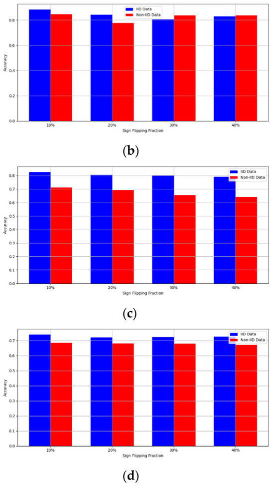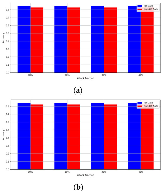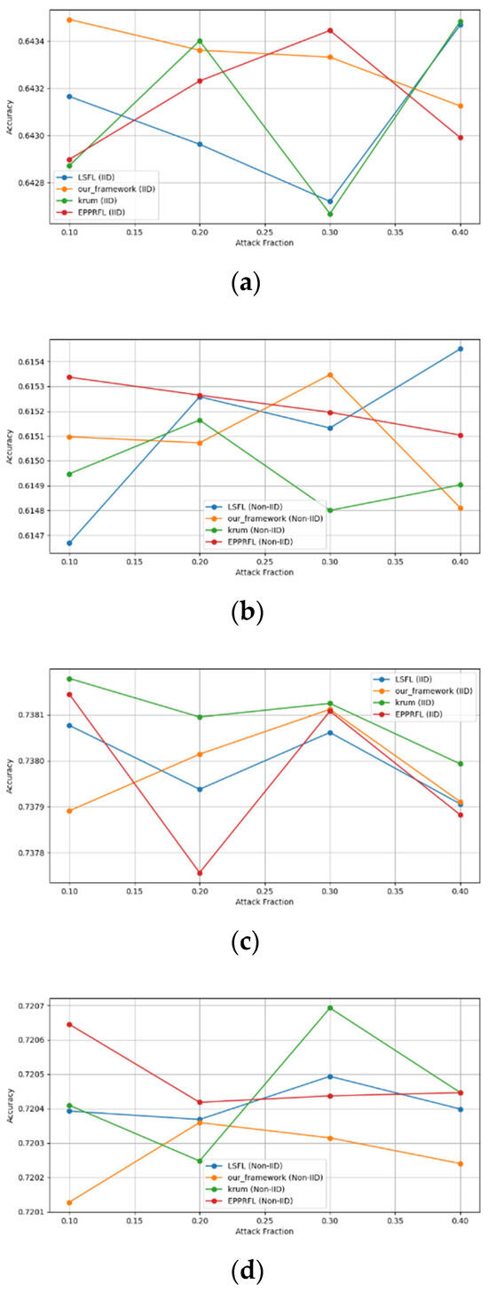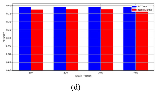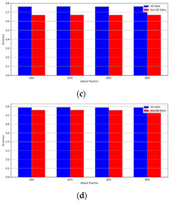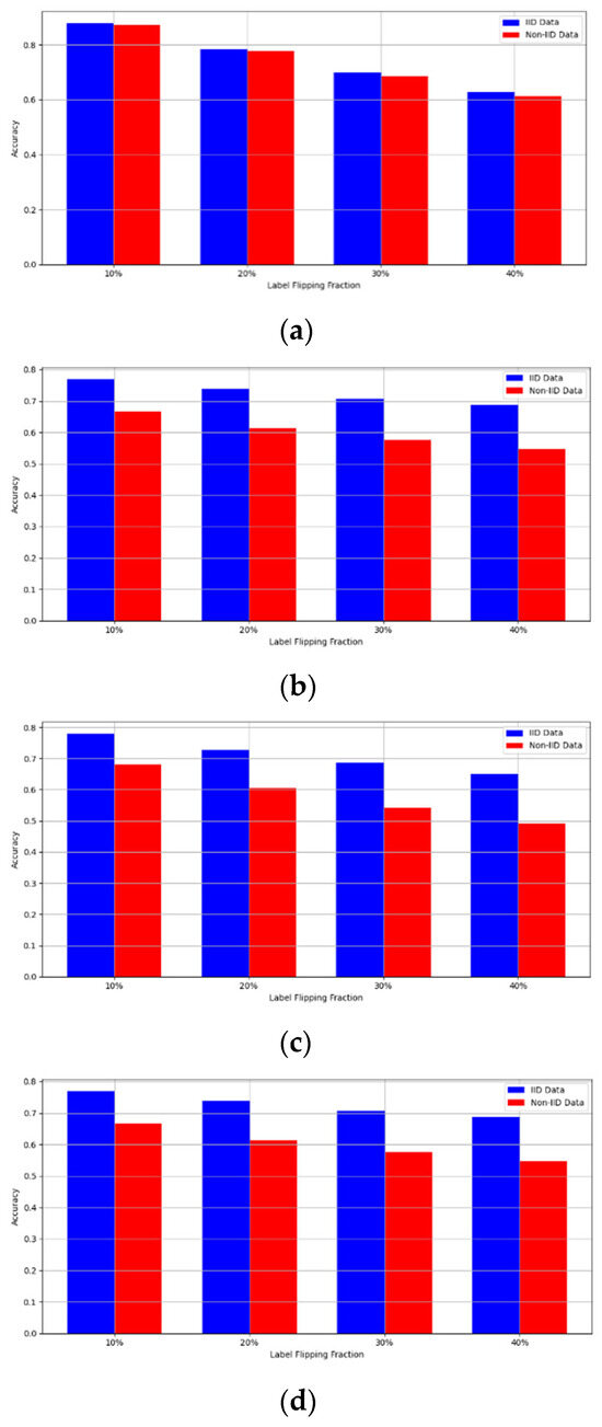 - Robustness Evaluation: We considered label flipping, sign flipping, backdoor, backdoor embedding, and gradient manipulation attacks on the MNIST and CIFAR-10 datasets in both IID and non-IID settings. The effectiveness of these attacks was evaluated by their impact on the model’s accuracy. First, we considered the attacks in situations where 10%, 20%, 30%, and 40% of the participants were poisoning attackers and evaluated the impact on the model’s accuracy. Figure 6, Figure 7, Figure 8, Figure 9 and Figure 10 illustrate the accuracy of our framework with varying numbers of label flipping, sign flipping, backdoor, backdoor embedding, and gradient manipulation attacks, respectively, using the MNIST and CIFAR-10 datasets in both IID and non-IID settings. Our framework demonstrated graceful degradation in accuracy as the attack fraction increased, maintaining an accuracy level of above 60% on all attacks, even at a 40% attack fraction, suggesting that the model is resilient to data heterogeneity and robust to poisoning attacks.
