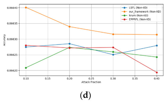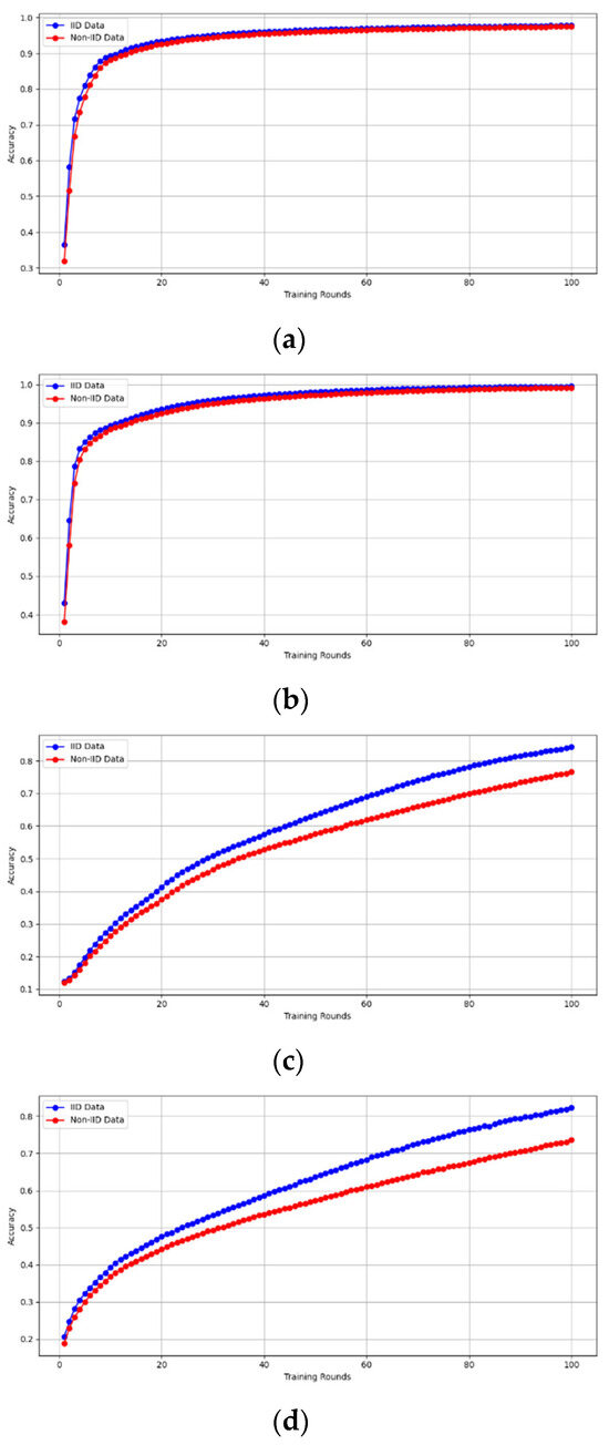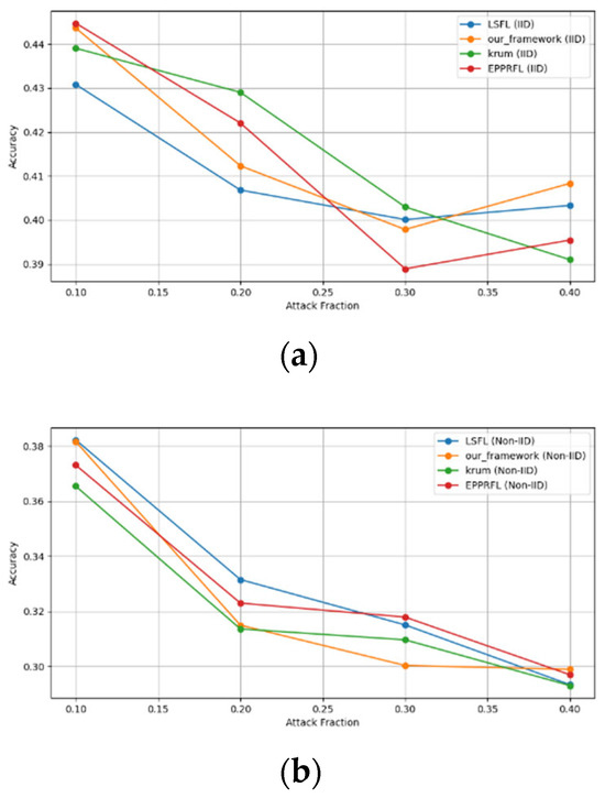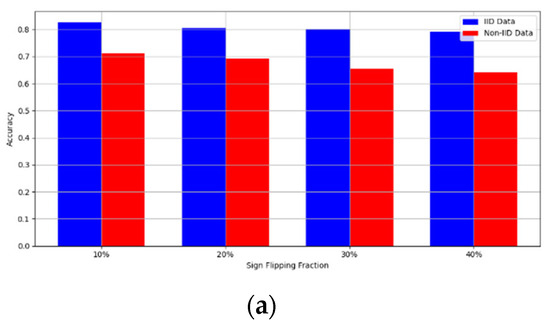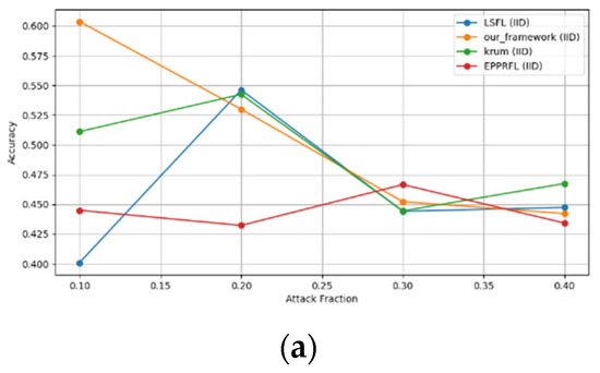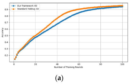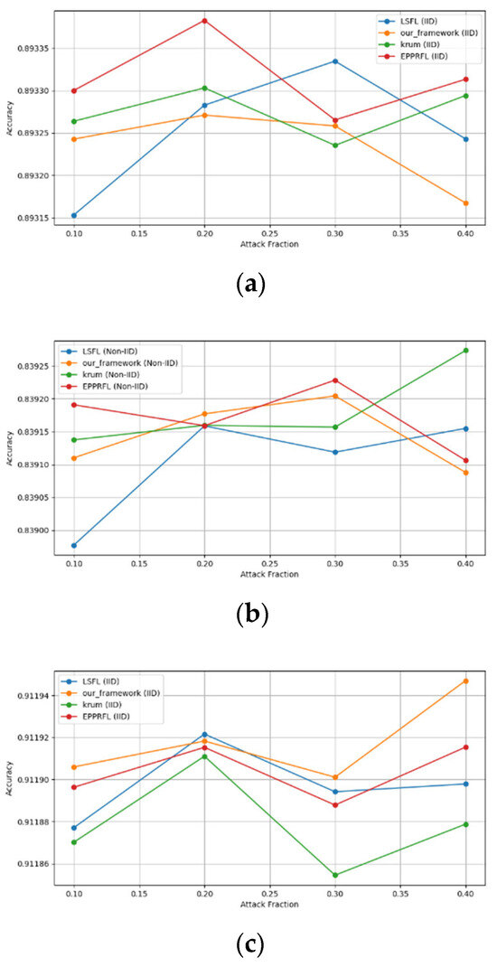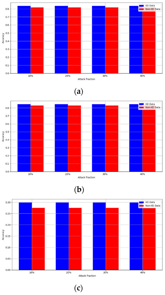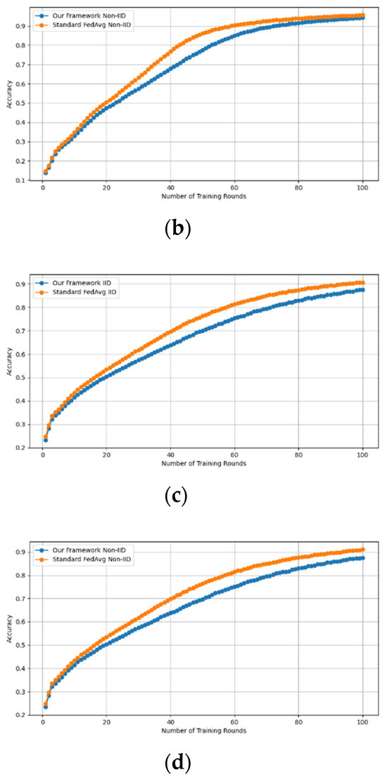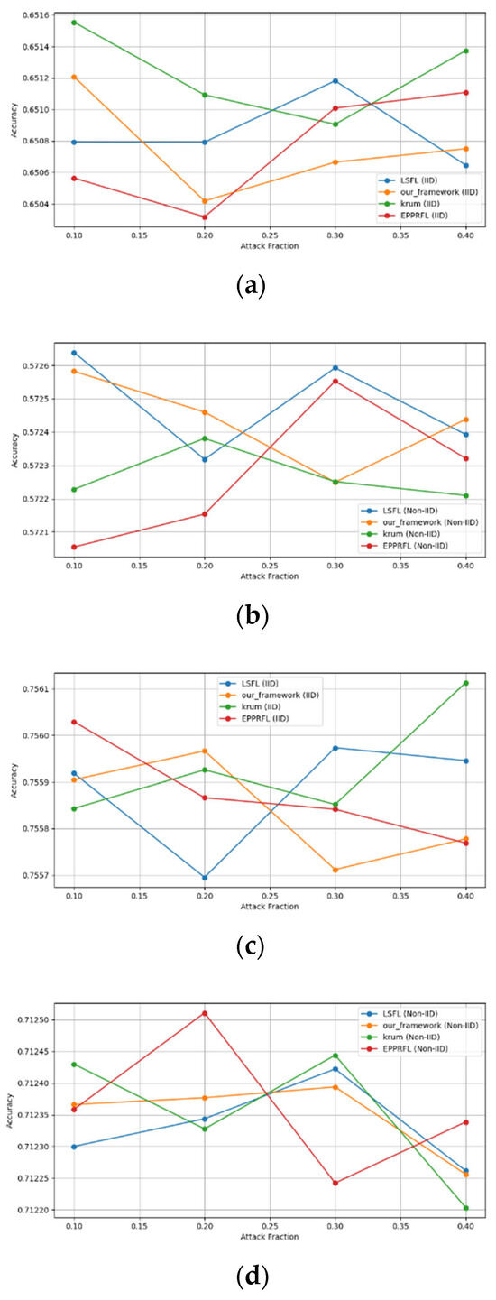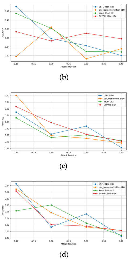 - Robustness Evaluation: We considered label flipping, sign flipping, backdoor, backdoor embedding, and gradient manipulation attacks on the MNIST and CIFAR-10 datasets in both IID and non-IID settings. The effectiveness of these attacks was evaluated by their impact on the model’s accuracy. First, we considered the attacks in situations where 10%, 20%, 30%, and 40% of the participants were poisoning attackers and evaluated the impact on the model’s accuracy. Figure 6, Figure 7, Figure 8, Figure 9 and Figure 10 illustrate the accuracy of our framework with varying numbers of label flipping, sign flipping, backdoor, backdoor embedding, and gradient manipulation attacks, respectively, using the MNIST and CIFAR-10 datasets in both IID and non-IID settings. Our framework demonstrated graceful degradation in accuracy as the attack fraction increased, maintaining an accuracy level of above 60% on all attacks, even at a 40% attack fraction, suggesting that the model is resilient to data heterogeneity and robust to poisoning attacks.