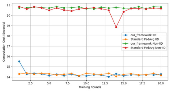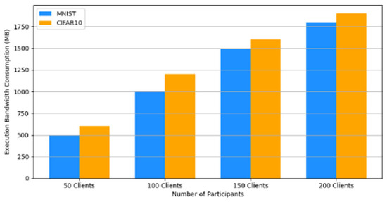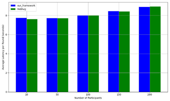 - Efficiency Evaluation: To evaluate the efficiency of our framework, we measured and compared the latency of FedAVG and our framework for various participants, providing a real-world efficiency comparison. Therefore, we tested FedAVG and our framework with varying numbers of participants (10, 50, 100, 150, and 200), and the result showed no difference despite the robustness of our framework. Figure 17 shows latency iteration over a varying number of participants. The average latency per round is the ratio of the total time to the number of rounds. This is conducted using MNIST and CIFAR10 datasets over the CNN model in an IID setting with the number of rounds set at 20. Moreover, we demonstrate that the communication overheads of our framework do not result in a drastic increase as the number of participants increases. Instead, it linearly increases with an increased number of participants, as shown in Figure 18. This implies that our framework would work with large-scale deployments. Finally, we show our framework’s computation cost per round in Figure 19 to reflect real-world performance.