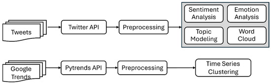 Figure 1 presents the integrated workflow used to examine public awareness and opinion by combining Twitter and Google Trends data. The top pathway outlines the Twitter-based analysis, which includes data collection via the Twitter API, preprocessing, and various forms of content analysis, such as sentiment analysis, emotion analysis, topic modeling, and word cloud generation, to capture the tone, themes, and discourse surrounding the event. The bottom pathway illustrates the Google Trends-based analysis, where data were collected using the Pytrends API and preprocessed for time series clustering. This clustering was conducted at the state level, allowing for the identification of both spatial and temporal trends in public search behavior. While Twitter analysis focuses on the content and emotional context of public discourse, the Google Trends analysis captures broader patterns of public interest over time and across geographic regions. Together, these complementary approaches provide a holistic view of public response to the event.