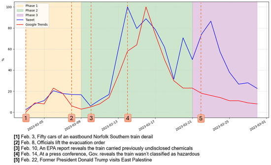 Google Trends is a website created by Google that analyzes the popularity of top search queries in Google Search across various regions and languages. It offers unique insights into the public’s awareness of specific events by monitoring Google search behaviors over time. For this study, we used Google Trends to obtain data related to Ohio train derailment events. While Google does not directly offer an API to extract data from Google Trends, PyTrends, an open-source Python library, allows a simple interface for automating downloading of Google Trends reports. It enables users to extract time-series data of Google searches related to keywords. When gathering data, Google Trends normalizes it by scaling according to the total search volume within a specific time period and location. The data are indexed on a scale from 0 to 100, where the peak popularity for a term in the chosen region and timeframe is assigned a value of 100. All other data points are scaled relative to this peak. In our study, we queried Google Trends for each state individually, indicating that the normalization process was applied on a state-by-state basis. Given this methodology, Google Trends can offer insights into how popular a term is across different areas, making it suitable for analyzing and cross-comparing relative trends over time.