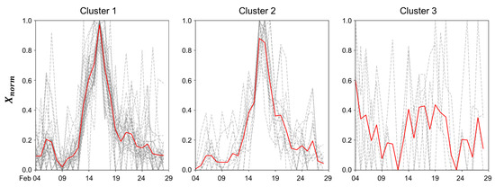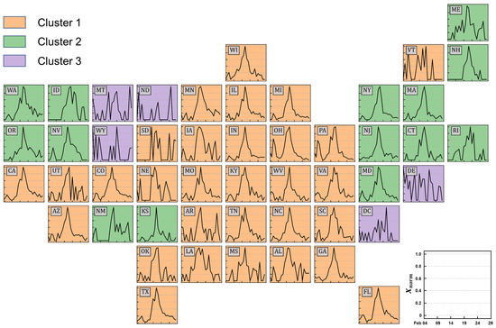 We first performed time-series clustering at the U.S. state level using Google Trends data as introduced in Section 2.2. Given the limited time series duration incorporated in our research, we opted for an unsupervised approach to this task. We deployed the Self-Organizing Map (SOM), an unsupervised learning algorithm originating from artificial neural networks, specifically crafted for high-dimensional data visualization and clustering tasks. The broad applicability of the SOM stems from its inherent flexibility, topological preservation, scalability, and concurrent dimension region and clustering capabilities, which have warranted its widespread usage across diverse domains [20,21,22]. By feeding the state-level Google Trends time series data into the SOM, we managed to optimize it via the quantization error [23]. This process resulted in a 1 × 3 neuron setting, which corresponds to three optimized time-series clusters. We set the learning rate as 0.16 and the sigma as 0.7. Our input time series ranged from 4 February to 28 February, thereby leading to a 25-dimension vector, i.e., . We derived a normalized vector , where .