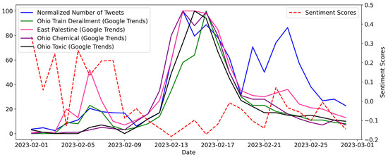 To address the second research question (Q2), which focuses on exploring the temporal changes in the sentiment and tone of social media discussions about the train derailment events in Ohio, we conducted sentiment and emotion analysis using Twitter data. Figure 5 illustrates the temporal trend of various factors related to the Ohio derailment event. The figure presents the number of geotagged tweets discussing the event, the trend of relevant keywords in the Google Search Engine, and the public sentiment scores at the national level.