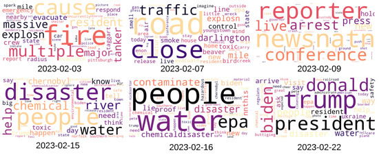 The third research question (Q3) aims to understand how trending topics related to the train derailment events in Ohio evolved over time on social media platforms. To comprehend these thematic fluctuations and patterns, we engaged in word cloud visualization and topic modeling analytical techniques. Word clouds serve as visual depictions of textual data, wherein the size of each word indicates its frequency and importance. Figure 6 features word clouds from six selected time points during the event, showcasing the trending topics on Twitter. Specifically, 4 February marked the second day of the train derailment event; hence, Twitter witnessed heated discussions revolving around keywords such as ‘fire’, ‘explosion’, and ‘resident’, among others. The significant impact of the train explosion led to the immediate closure of roads to Palestine, resulting in the emergence of ‘traffic’, ‘road’, and ‘close’ as prominent topics. On 9 February, the arrest of a news reporter covering a press conference became another point of focus. As the event transitioned into its second phase, discussions turned toward the issue of EPA, water contamination, and pollution. When Donald Trump visited Palestine, Ohio, on 22 February, it catalyzed a new burst of social media conversation.