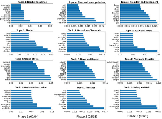In addition to word frequency analysis, we further analyze the main topics discussed on social media platform using LDA model, which well depicted the topic trends in three phases. We selected three dates for the analysis, including 4 February in Phase 1, 15 February in Phase 2, and 25 February in Phase 3. At each time point, we selected four topics, and each topic included 10 words. As shown in Figure 7, on the 2nd day of the event, many tweets centered on the discussion of urgent needs for action, including the primary topics of the cause of the fire, resident evacuation, shelter, and nearby residents. In Phase 2, new topics emerged that showed deeper understanding and concern about the broader impact of the event, especially the rising anxiety about hazardous chemicals. Therefore, Twitter users were primarily discussing trustees to the local government, hazardous chemicals, and river and water pollution. For instance, residents in East Palestine expressed their distrust in public officials and Norfolk Southern during a meeting where the scale of the disaster and public health threat caused by the derailment was not effectively communicated. In Phase 3, as the event moved further into the public’s consciousness, discussions shifted to broader themes of safety, accountability, and community resilience. For instance, people remain concerned about potential impacts on water quality, possible chemical hazards, and the government’s response—particularly the actions and statements from the president, any assistance packages offered, and the broader implications of such a disaster on national policy.