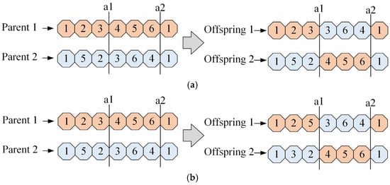Improved Crossover Strategy: Conventional genetic algorithms often employ sequential crossover to generate new offspring. However, the resulting offspring may contain duplicate ports. As illustrated in Figure 2a, for parent 1 and parent 2, selecting crossover points a1 and a2 produces offspring 1 and offspring 2, which fail to visit all ports.