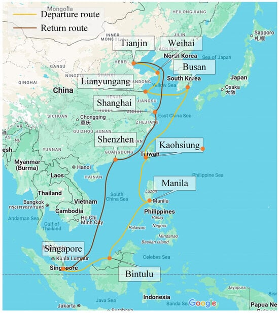 (2) The decisions regarding shipping routes and speeds are exclusively associated with the vessel’s navigation process. Consequently, this study confines its focus to the fuel consumption costs and emissions generated during the ship’s voyage [].