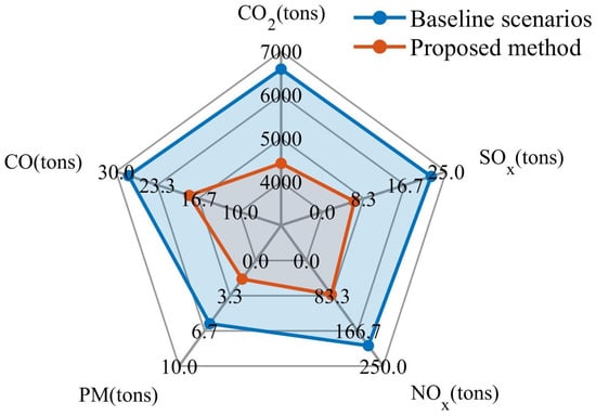 To assess the impact of decision optimization on vessel emissions, we also calculated the CO2, NOx, SOx, PM, and CO emissions for both the baseline and optimized scenarios. The results are illustrated in Figure 6, which shows that the optimized decision-making scheme demonstrates significant potential in effectively reducing emissions of CO2, NOx, SOx, PM, and CO from vessels, thereby contributing to the preservation of the global ecological environment.