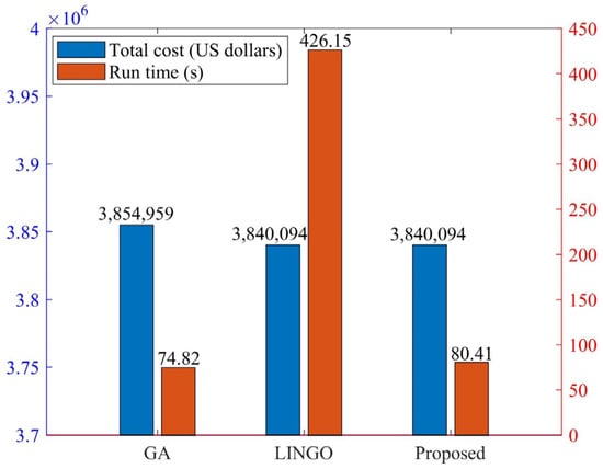 Comparison results of proposed method, the genetic algorithm, and the LINGO solver.