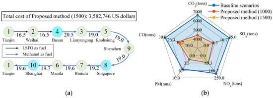 The optimized route and speed are shown in Figure 5b. It can be seen that the optimized port-of-call sequence and speed are different from the baseline scenario, that is, Tianjin (Port 1) Weihai (Port 2) Busan (Port 4) Lianyungang (Port 3) Kaohsiung (Port 5) Shenzhen (Port 9) Singapore (Port 8) Bintulu (Port 7) Manila (Port 6) Shanghai (Port 10) Tianjin (Port 1). Constrained by the methanol tank capacity, the vessel is limited to utilizing methanol exclusively within the designated blue segments of the voyage. In the remaining segments, the ship is compelled to resort to the more costly LSFO as an alternative. The decision-making optimization process resulted in a total voyage cost of 3,840,094 USD for the vessel, representing a reduction of 713,935 USD compared to the baseline scenario.