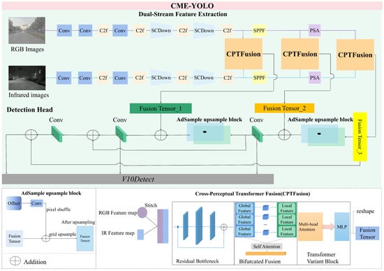 Unlike traditional cross-modality algorithms, the research focus of the proposed CME-YOLO is on optimizing the entire process from cross-modality feature fusion to the input of the detection head, ensuring that key features are precisely extracted and effective information is fully enhanced. To achieve this, CME-YOLO introduces the Cross-Modality Perception Transformer Fusion module (CPTFusion) and the Adaptive Upsampling module (AdSample). In the feature fusion stage, CPTFusion enhances the abstract expression of key features through multi-scale feature extraction and Transformer attention mechanisms, optimizing the fusion strategy for different modality features and fully leveraging the complementarity of infrared and visible light modalities. In the upsampling stage of the detection head, AdSample utilizes convolutional neural networks to dynamically adjust the sampling region, expanding the effective information in the feature map and further enhancing feature expression. Through this comprehensive optimization design, CME-YOLO excels in feature extraction, fusion, and enhancement, demonstrating outstanding performance and robustness in handling complex scenes and adverse weather conditions. In the future, with the advancement of research and technology, the performance of multimodal target detection is expected to be further improved, playing an important role in more practical applications.
