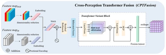 During the cross-modal feature fusion stage, this paper introduces the Cross-Perception Transformer Fusion module (CPTFusion). Specifically, after the dual-stream feature extraction network provides feature maps for each modality, we first employ a residual bottleneck structure that involves dimensionality reduction, followed by dimensionality expansion, and then dimensionality reduction again. This approach reduces the parameter count while preserving critical information. Subsequently, a multi-scale feature extraction module with global and local cross-perception is utilized for feature enhancement, strengthening the expression of key information. Ultimately, the Transformer attention mechanism is leveraged to identify the optimal fusion strategy, achieving the most effective feature fusion.