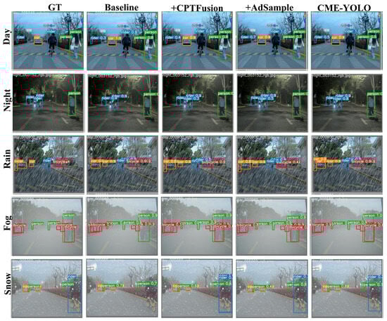 Figure 10, the baseline often missed detections in low-light or adverse weather conditions, such as failing to detect cyclists in low light, cars in the rain, bicycles in fog, and cyclists in snow. After adding CPTFusion, although the missed detection issue was resolved, the detection accuracy of various targets, especially small targets, still needed improvement. After adding AdSample, the model became more sensitive to small targets. For example, in rainy scenes, the mAP of cars increased from no detection to 0.5 with CPTFusion and to 0.8 with AdSample, fully demonstrating AdSample’s enhancement of image processing details and significant improvement in small target detection accuracy. The combination of CPTFusion and AdSample, which is the CME-YOLO algorithm proposed in this paper, not only solved the missed detection issue but also significantly improved detection accuracy. For example, in the aforementioned rainy scene, the mAP of the car detection increased to 0.9. Similar improvements were observed under other lighting and weather conditions. It is evident that CPTFusion and AdSample not only individually improved different aspects of the model’s detection performance but also, when combined as in CME-YOLO, efficiently fused and dynamically upsampled the data to capture more detailed and smooth information, significantly enhancing the model’s detection performance and robustness.
